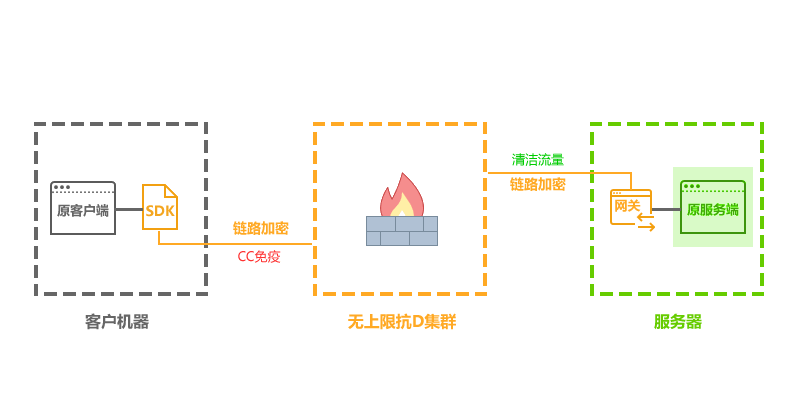 基于客户端 SDK 封装,断点续连无缝切换,让客户的游戏彻底免疫 CC 攻击,完美解决攻击困扰。